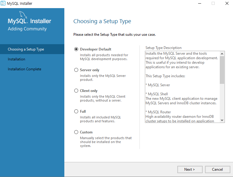 이런창이 뜨는데 mysql의 모든것을 설치하지않고 필요한것만 설치를 하려면 맨밑의 custom을 클릭하고 next를 누른다