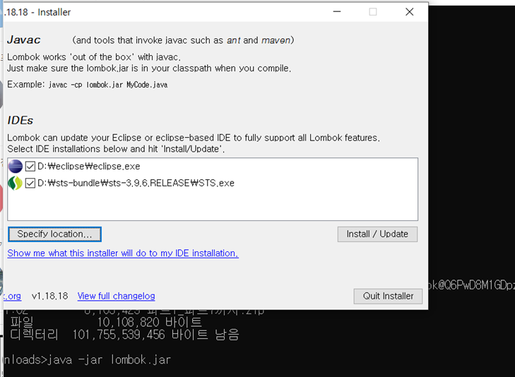 java -jar lombok.jar 을 실행했다. 내가 받은 롬복 jar 파일 이름을 치면된다.