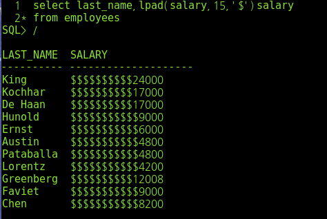 3. employees 테이블로부터 사원들의 last_name과 salary를 출력하되 특히 급여는 15 자리로 표시하고