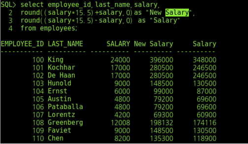 1. employees 테이블로부터 사원들의 id, name, salary,와 15.5% 인상된급여 new salary, 새 급여에서 이전 급여를 뺀 값을